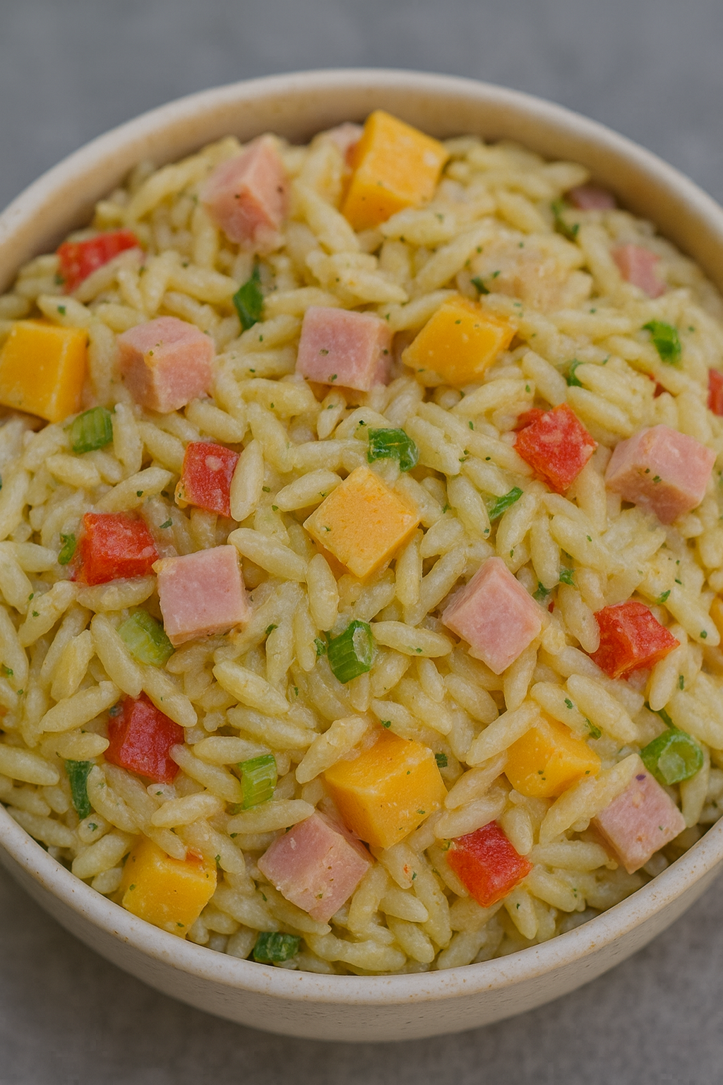 Składniki: 250 g makaronu orzo (lub ryżowego makaronu w kształcie ziarenek ryżu) 150 g szynki (np. konserwowej, gotowanej…