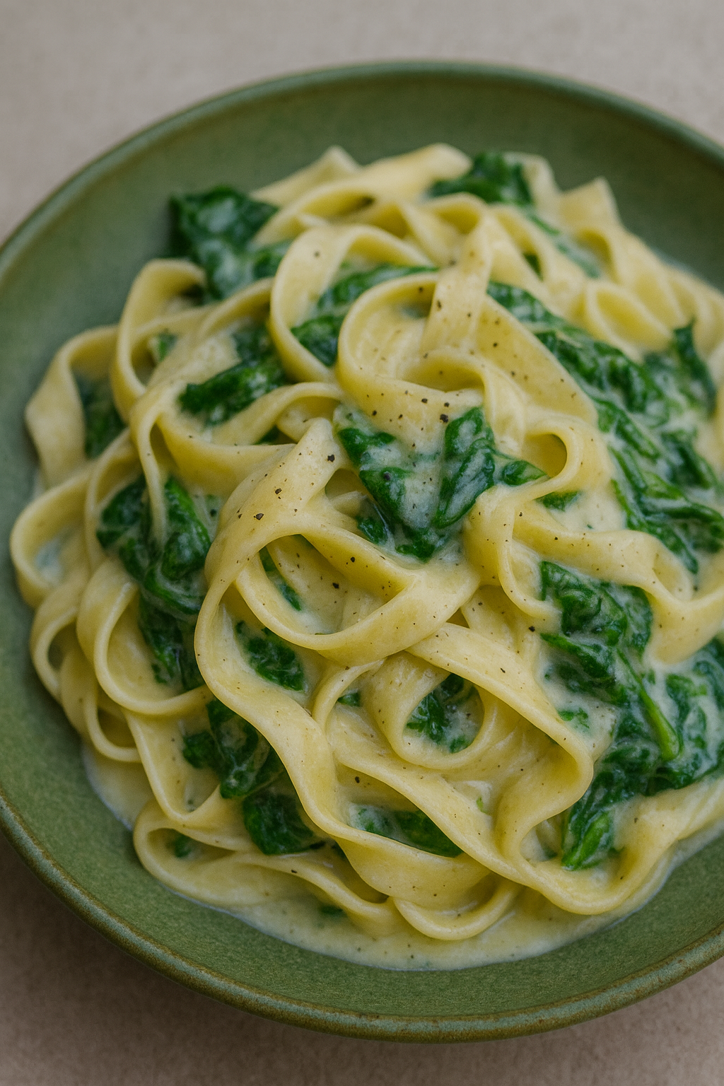 Składniki: 250 g makaronu tagliatelle 200 g świeżego szpinaku (lub mrożonego, liściastego) 200 ml śmietanki 18% lub 30%…