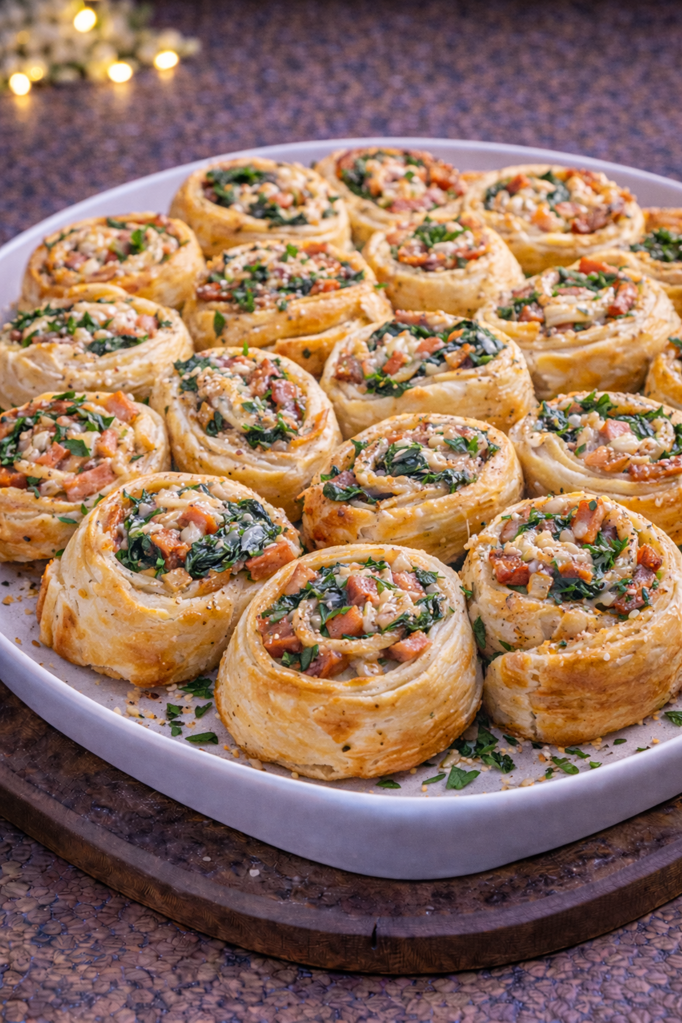 Składniki: 2 płaty ciasta francuskiego 200 g świeżego szpinaku 150 g boczku wędzonego 200 g sera żółtego tartego…