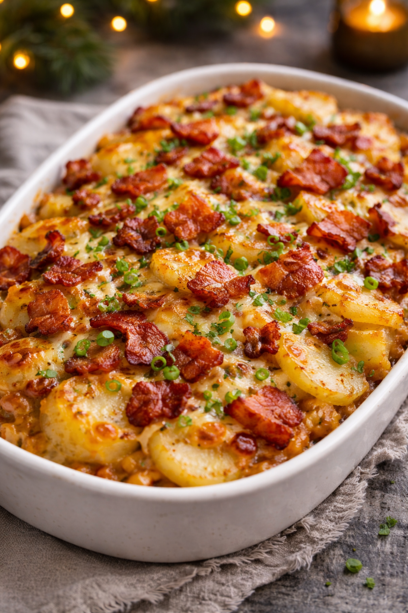 Składniki: 1,5 kg ziemniaków 250 g boczku wędzonego 1 średnia cebula 300 ml śmietanki 30% 150 ml mleka…