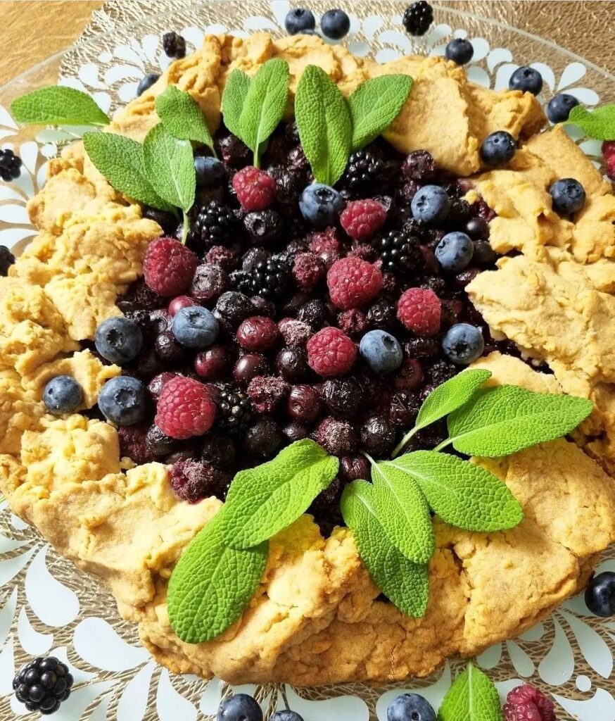 Wszystkie składniki na ciasto dodaj na stolnicę, a następnie zgnieć ciasto. Ciasto musi być gładkie i jednolite. Przygotowane ciasto rozwałkuj na stolnicy. Następnie przełóż je do blaszki wyłożonej papierem do pieczenia (ciasto musi wystawać poza formę tak by móc złożyć boki w kształt rustykalnej tarty). Na środek ciasta wyłóż umyte i wymieszane w mące owoce. Boki ciasta zginaj do środka. Nadaj ciastu kształt tarty. Wyjmij ciasto wraz z papierem. Przełóż je do płytkiej dużej blaszki i piecz 45/50 minut w 180 stopniach- grzanie góra-dół.