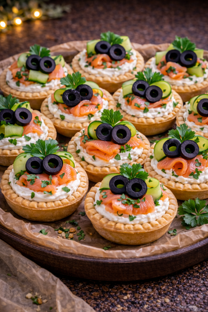Tartaletki z kremem serowym, łososiem wędzonym, ogórkiem i czarnymi oliwkami