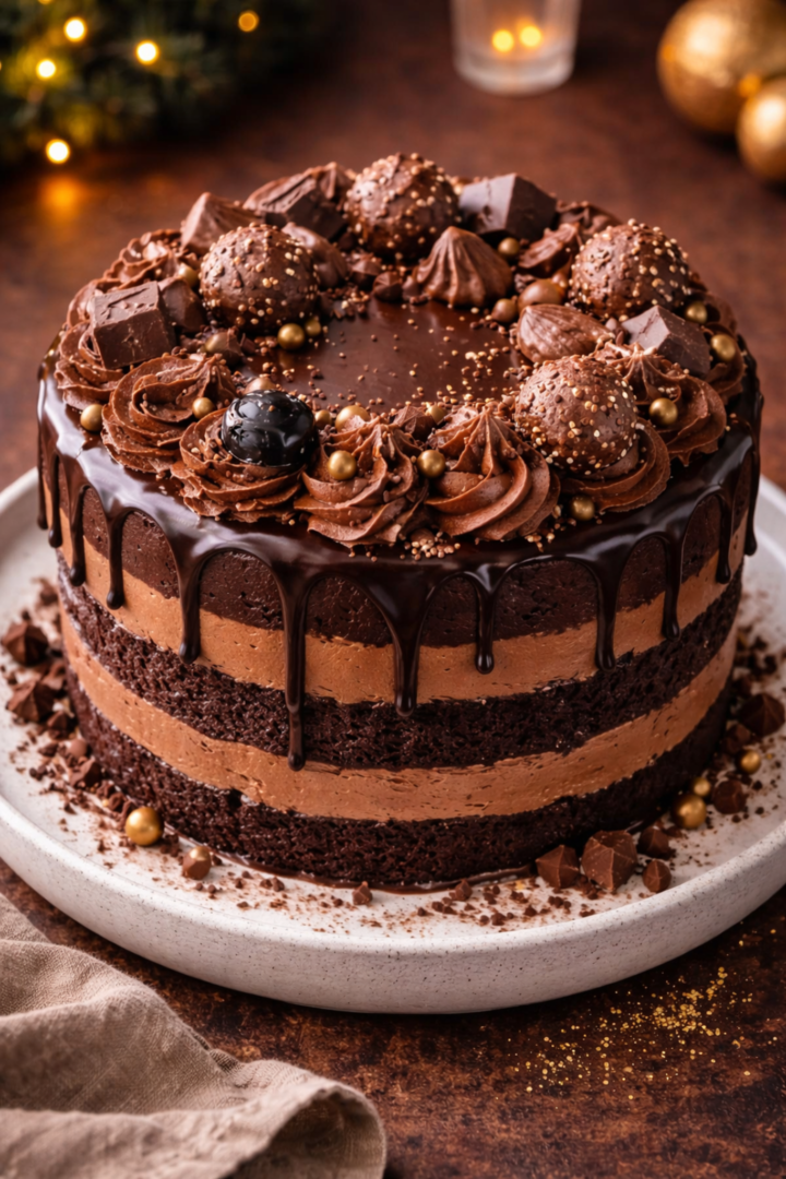 Tort czekoladowy warstwowy z kremem czekoladowym i polewą