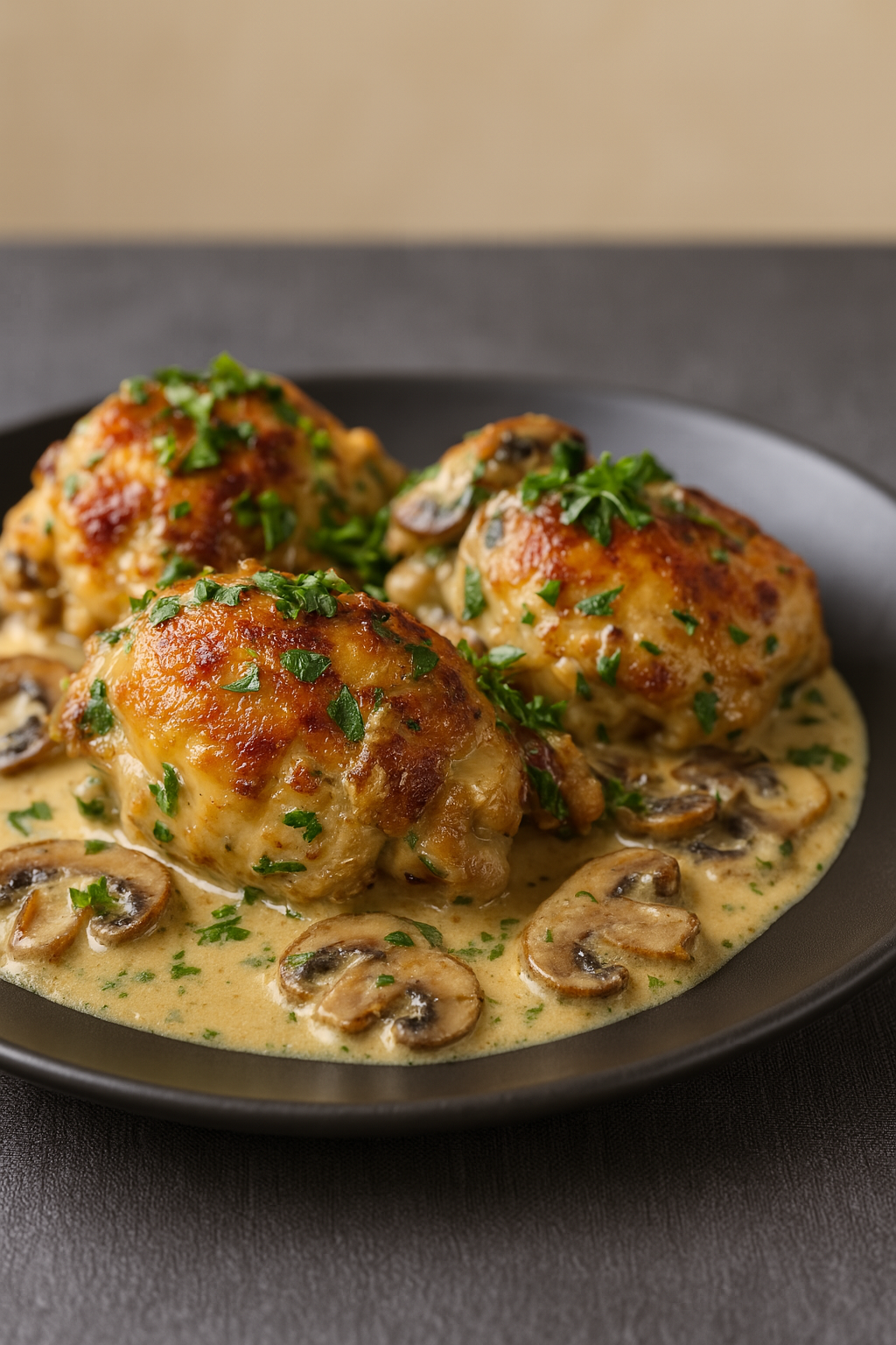 Pieczone udka kurczaka w sosie śmietanowym z pieczarkami