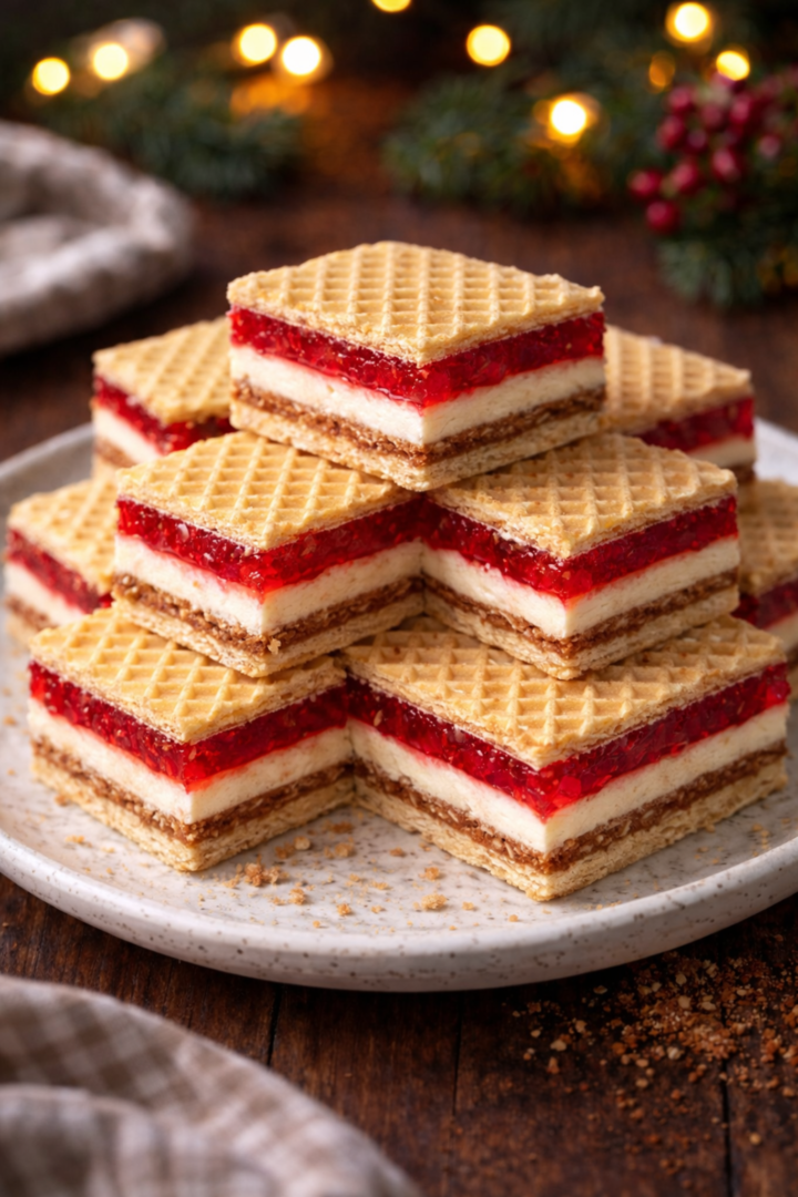 Wafle z kremem śmietankowym i warstwą galaretki malinowej
