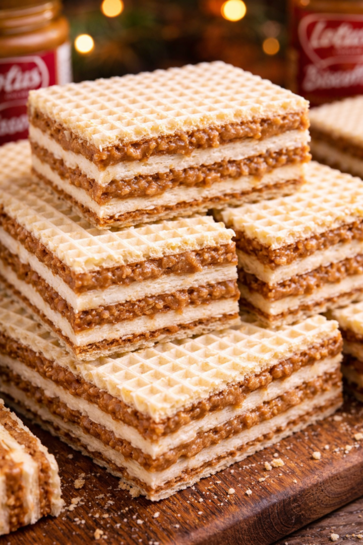 Przykryj kolejnym waflem i powtarzaj przekładanie do wyczerpania blatów.