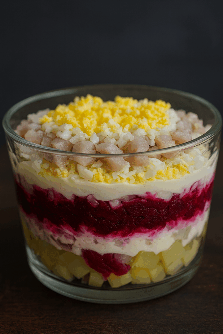 Serwuj w szklanej misce, aby pięknie było widać kolorowe warstwy. Świetnie pasuje do świątecznego stołu i spotkań rodzinnych.