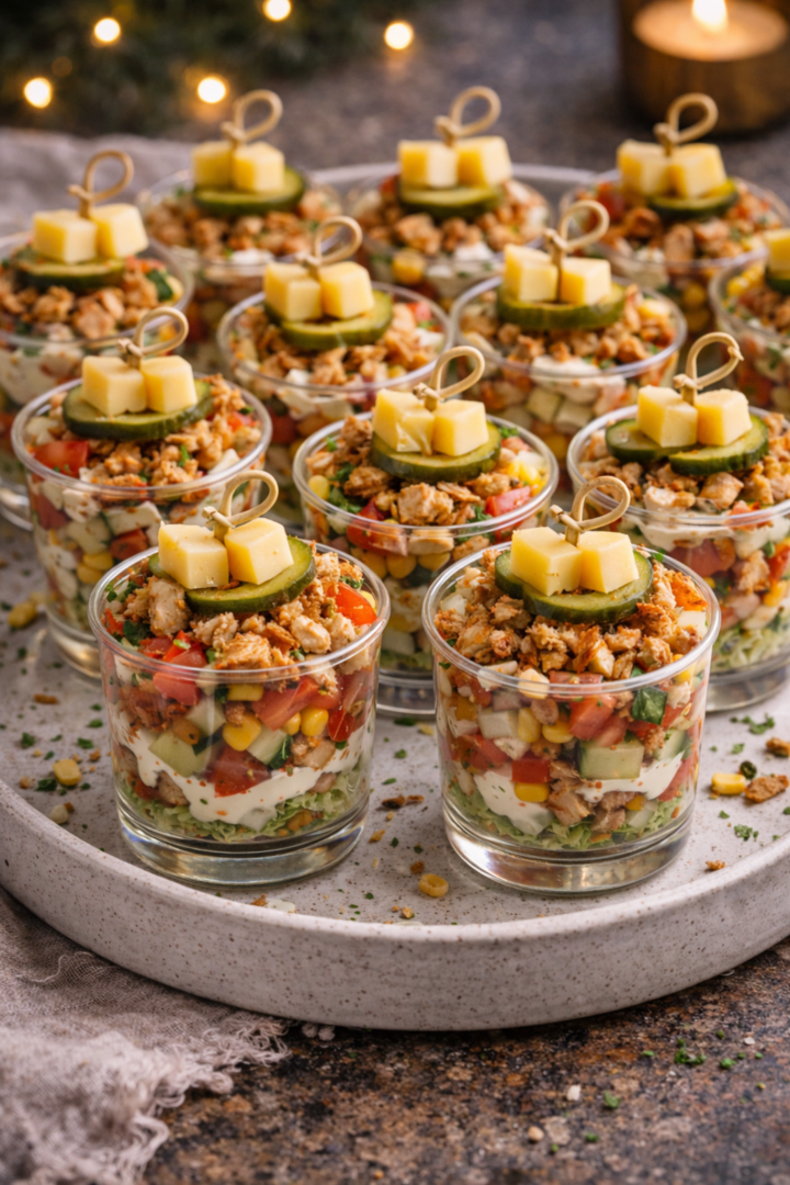 Warstwowe sałatki z kurczakiem w pucharkach