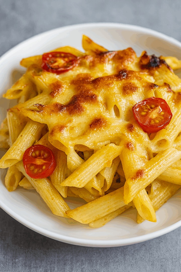 Na wierzchu ułóż resztę pomidorków i posyp resztą sera. Piecz w piekarniku nagrzanym do 180°C przez 20–25 minut, aż ser się roztopi i lekko zarumieni.