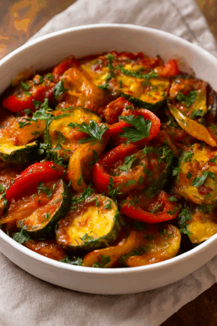 Na dno wylej część sosu pomidorowego. Rozłóż warzywa równomiernie na blasze wyłożonej papierem do pieczenia lub w naczyniu żaroodpornym. Zalej drugą wartwą sosu. Wstaw do nagrzanego piekarnika i piecz przez 20–25 minut, aż warzywa staną się miękkie i lekko skarmelizowane na brzegach.