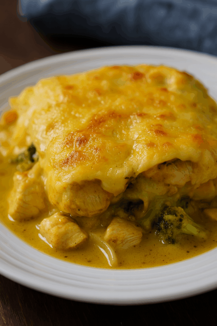 Zapiekanka z kurczakiem, brokułem i serem w sosie curry