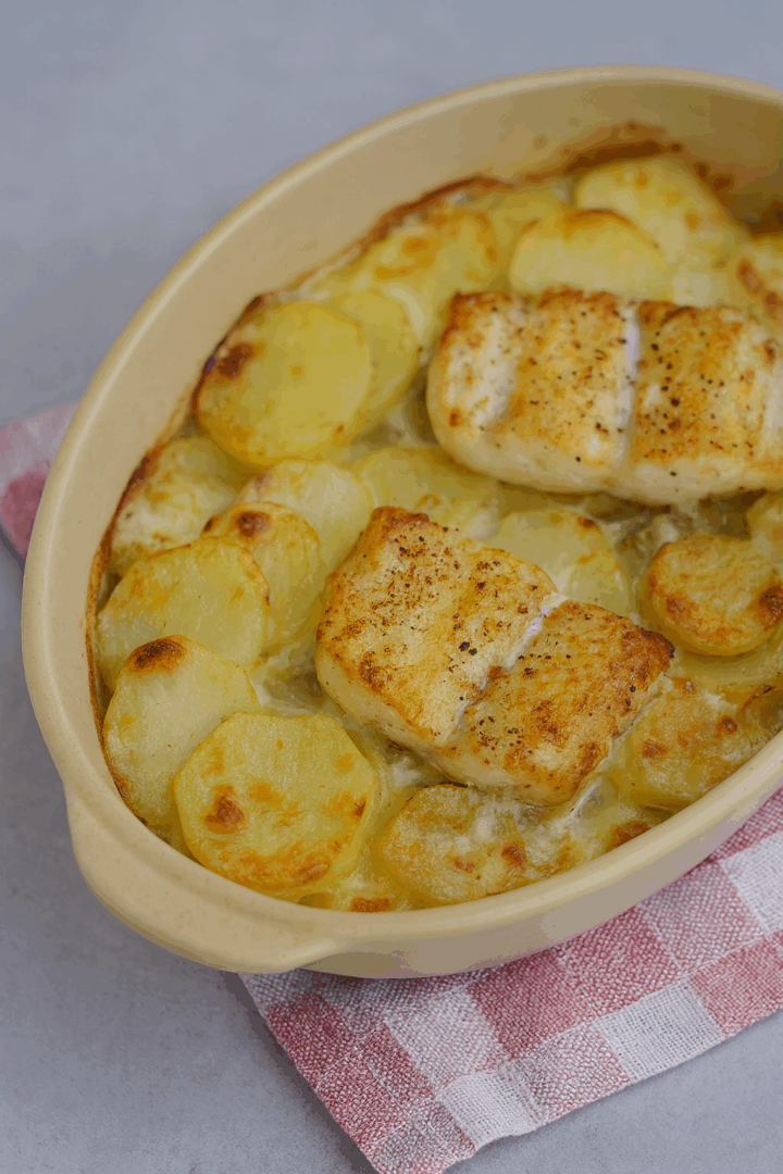 Piecz w piekarniku nagrzanym do 190°C przez 30–35 minut, aż ziemniaki będą miękkie, a wierzch ładnie się zarumieni.