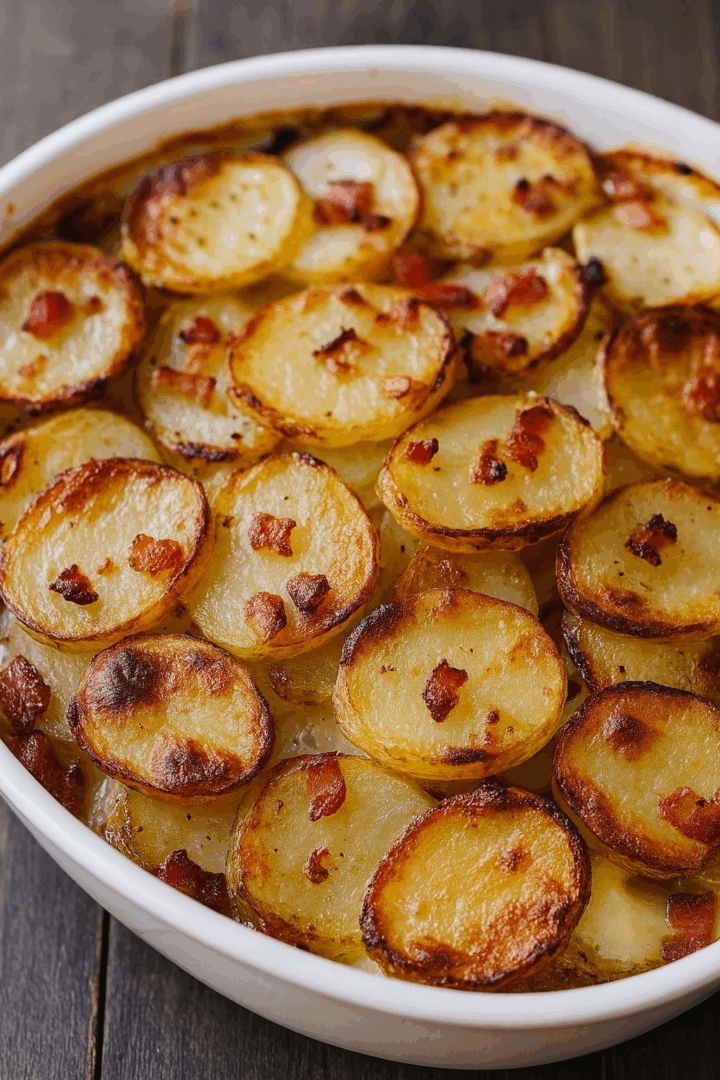 Ułóż warstwę ziemniaków, następnie część boczku z cebulą.