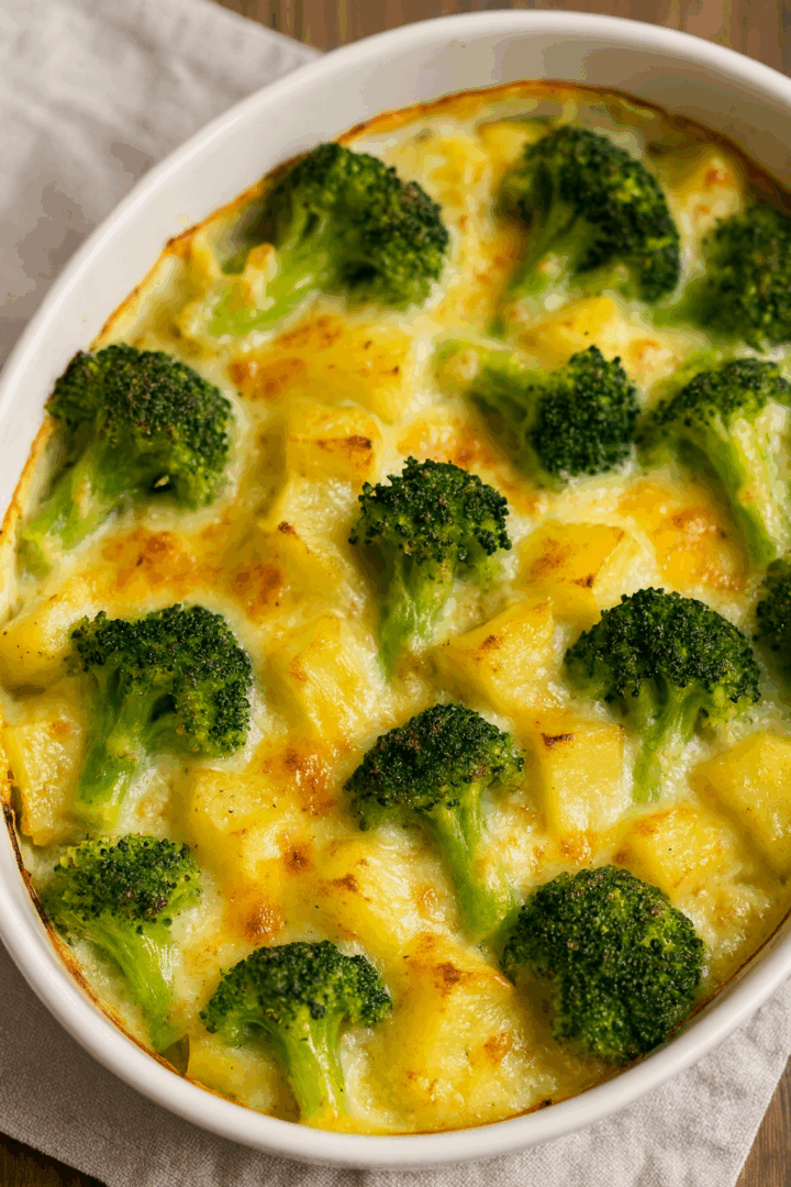 Na dnie rozłóż ziemniaki, potem brokuły.