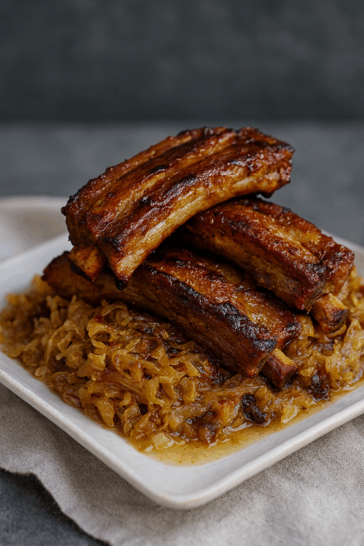 W żaroodpornym naczyniu lub gęsiarce ułóż warstwę kapusty, następnie żeberka, a na wierzchu resztę kapusty.