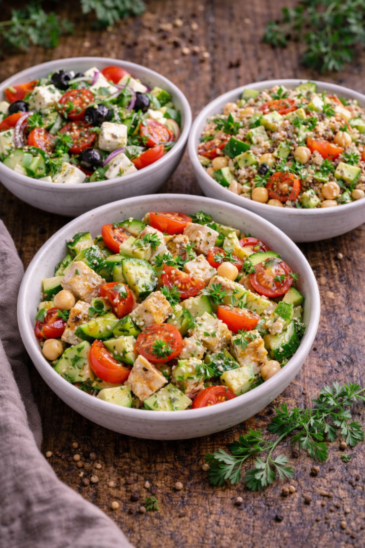 Zestaw trzech sałatek: grecka, z ciecierzycą i kaszą, ogórkowa z fetą