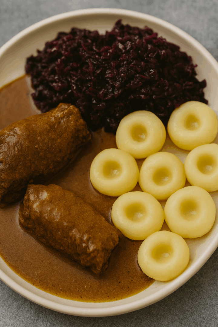 Zrazy wołowe z sosem, kluskami śląskimi i modrą kapustą