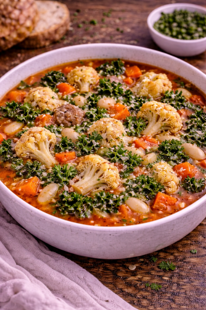 Zupa jarzynowa z kalafiorem, jarmużem i fasolą