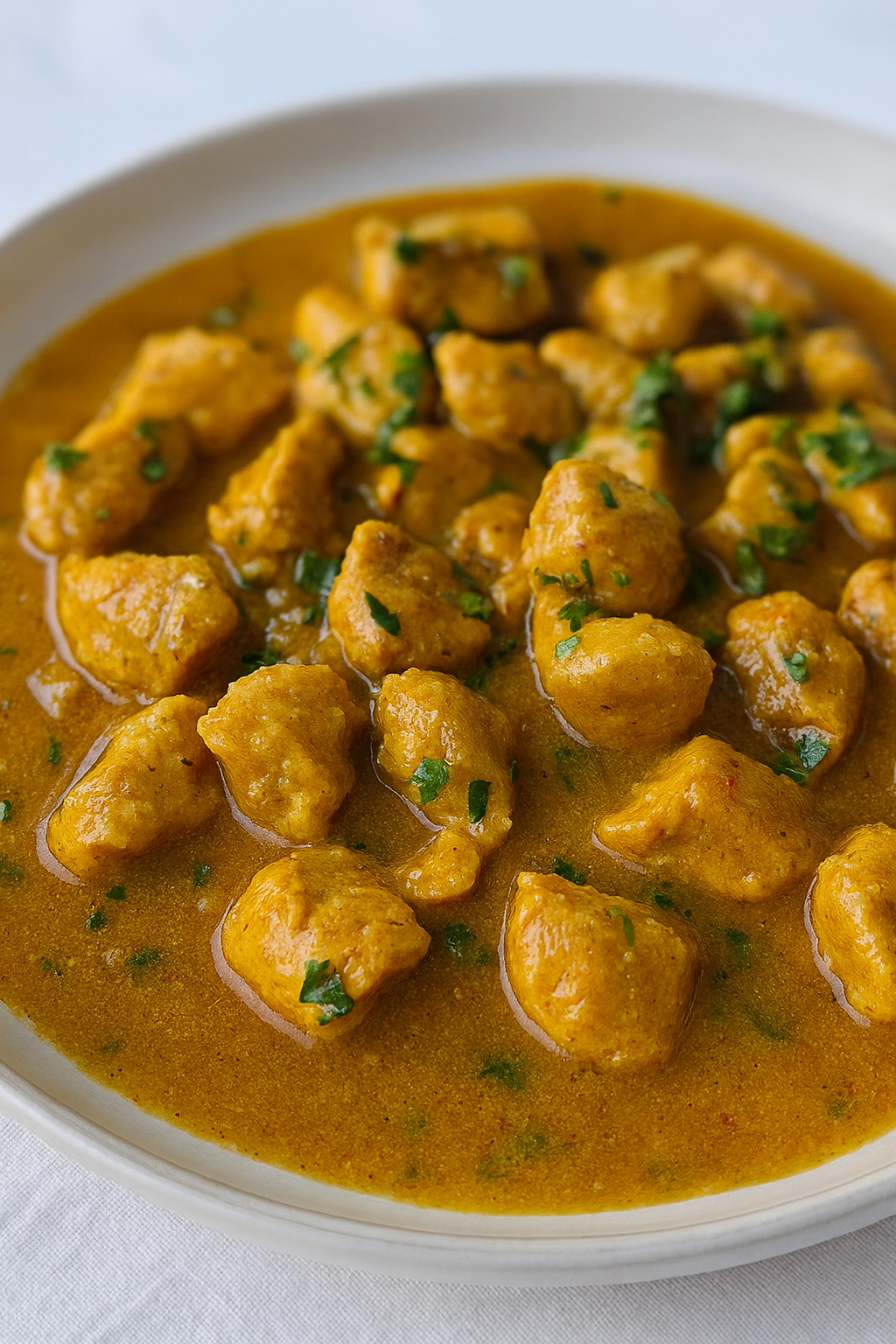 Składniki: (4 porcje): 500 g piersi z kurczaka lub mięsa z udek (pokrojonego w kostkę) 1 duża cebula…