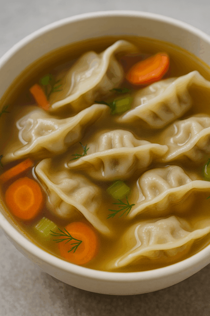 Do gorącego bulionu wrzuć pierożki (świeże gotują się ok. 5–6 minut, mrożone 7–8 minut).