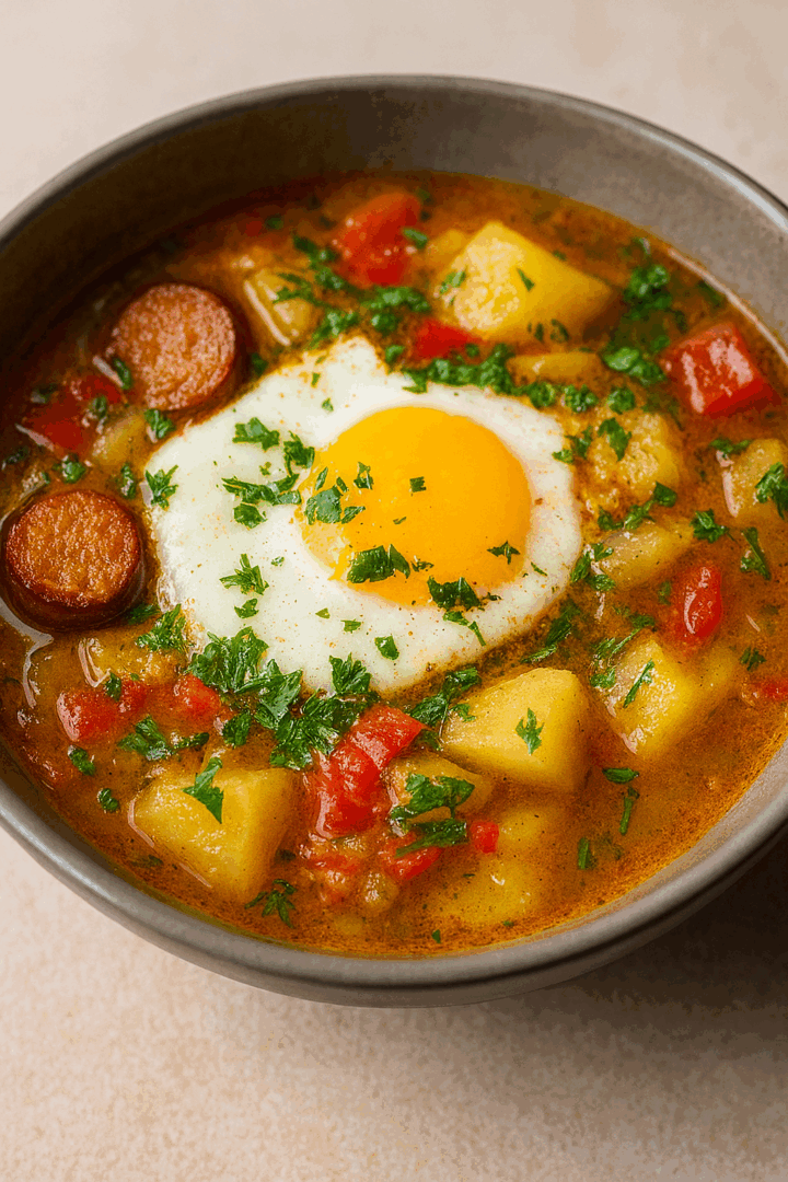Rozlej gulasz do głębokich talerzy, w każdej porcji połóż sadzone jajko.